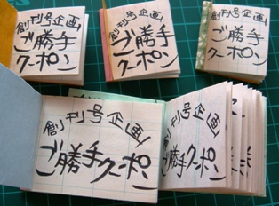 5部発行というハクをつけるために創刊号では内容を統一していますが、効率を上げるために使用している名字は変えておりますことをご了承ください。では『ご勝手クーポン』の内容を説明しましょう。このクーポンは、これを手にしたひとが勝手にクーポンに出来るクーポンです。しかしこれをクーポンとして使用できるか否かは、これを手にしたひとがどう動くかによって決まります。
