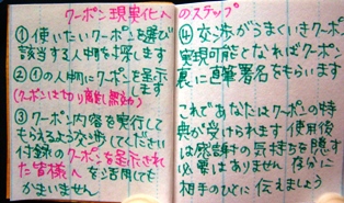 このクーポンは冊子のままで提示せねばならず、切り離すとクーポン内容は無効となり、その特典を受けることは出来ません。このページに田中さんから直筆のサインをいただく時、横のクーポン内容が田中さんに知られることとなります。ここに、ひとつのメリットがあるのです。