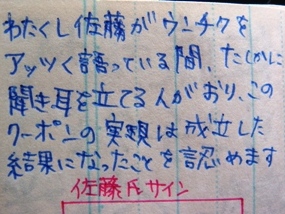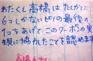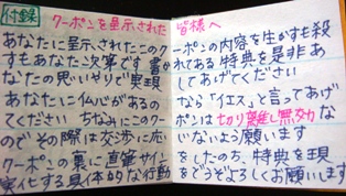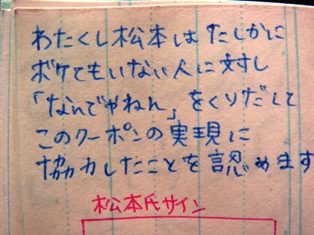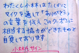 クーポン裏の直筆サインの協力したことを認める文句では、選挙カーに乗っている小林さんを想定し、政治家口調で書いておきました。これに直筆サインをしてくれるような小林氏にだったら、清き一票を入れてもいいかもしれませんね。