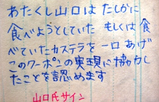 あなたは、今まさにカステラを食べている山口さんか、カステラを食べようとしている山口さんを探さなければなりません。一口もらわなければならないのです。一切れではありません。「ちょっとだけわけてもらう」というシチュエーションですから、あなたの交渉がマズいものであったら、山口さんは自分のカステラをあなたに分け与えてはくれないことでしょう。あなたの力がさらに試されるクーポンです。長崎に旅行のご予定がおありなら、この『有料』を是非ともご持参することをおすすめします。当研究所調べですが山口さんは高確率でカステラが好物です。もし食べようとしている、もしくは食べている山口さんを幸運にもみつけだすことが出来たとしても、一口わけてもらうことは難しいかもしれないのです。だって山口さんの好物はカステラなんですから。山口さんが好物のカステラをあなたに一口わけてあげる義理はもともと無いのですから。そのことを重々ドタマに叩き込んで交渉にあたってください。