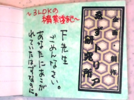 とくに絵心を必要とする3LDK(コードネーム)の動員には手を焼いており、前3LDKをクビにして新3LDKに「ぴらぴら」を描いていただくのに随分と骨を折りました。天才画伯や天才作家は気分がノるまでが長いという厄介な才能をお持ちなので、凡人編集長はお気分がおノりにならない天才画伯のおケツを叩かせていただく役割ですが、いかんせん研究員不足ですからこの「凡人編集長」も今のところ所長が兼任なのです。未来に不安を抱いている時間がとれないほど、所長、今がアップアップ。